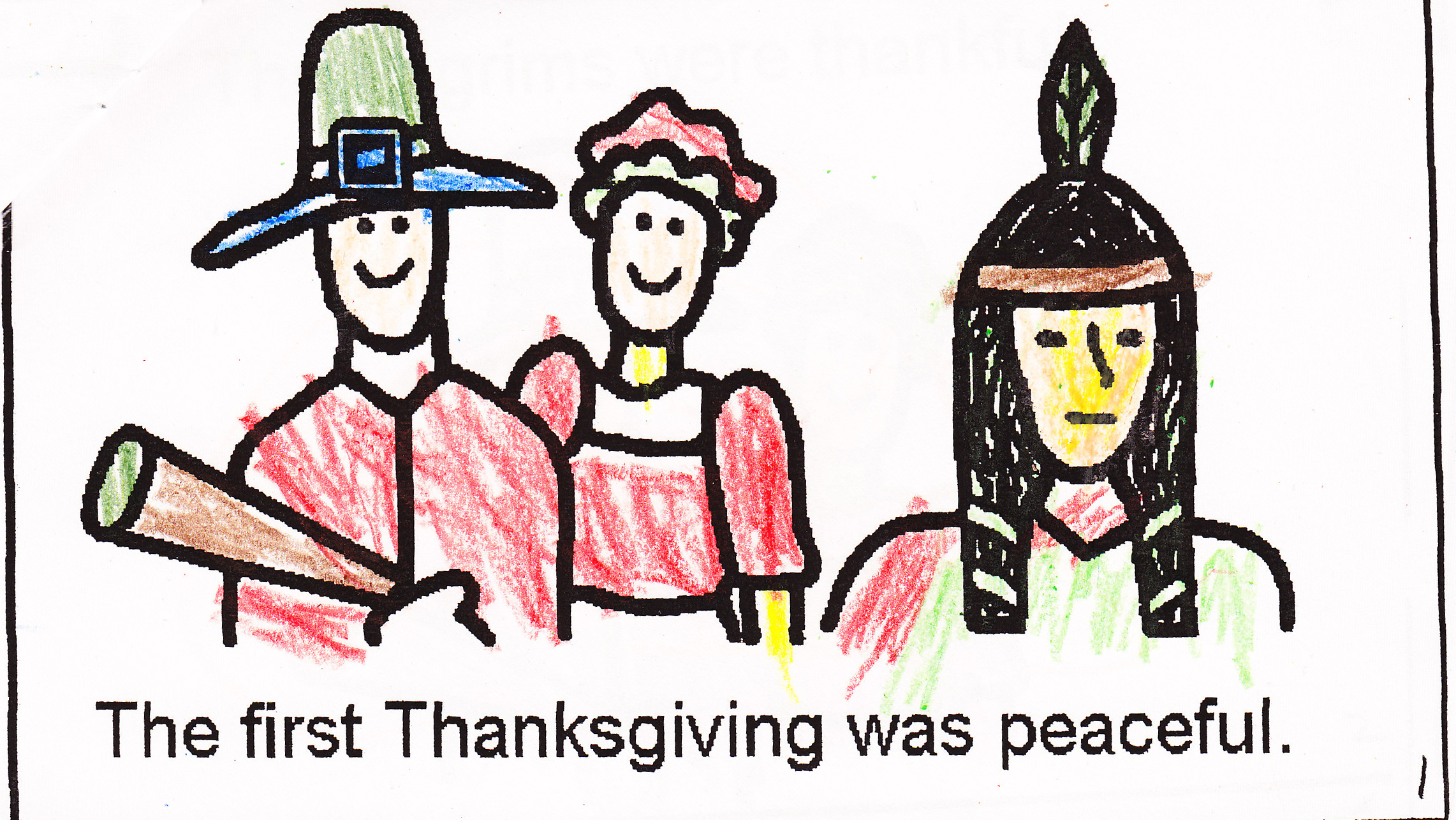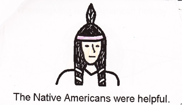 My oldest daughter, Z,  is in 2nd grade and for the last three years I have needed to “re-teach” her about Thanksgiving. This year she told me her teacher had read the class a book about the Pilgrims coming to America and how the Indians helped them. She told me about “the first Thanksgiving” where the Pilgrims and the Indians sat down and shared dinner on that day. In 1st grade she shared a similar story with me that she had learned in school. And in Kindergarten, she brought home a photocopied book she had made, the first few pages are shown below.